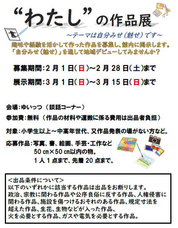 趣味や経験を活かして作った作品を募集し、館内に展示します。