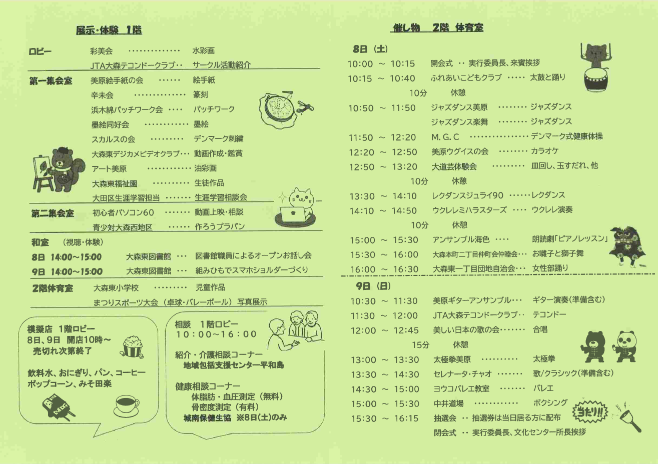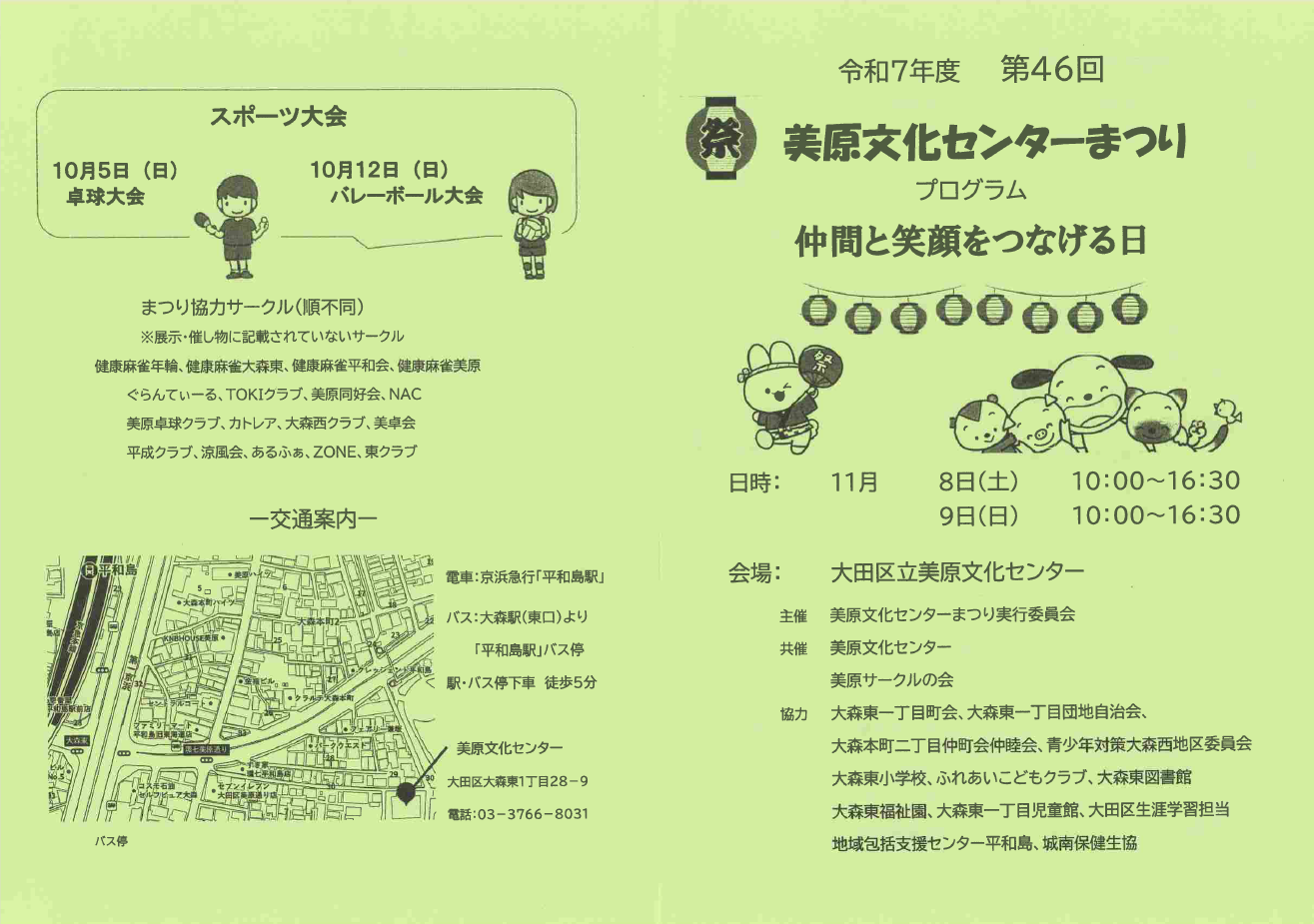 主催:美原文化センターまつり実行委員会 共催:美原文化センター、美原サークルの会 協力:大森東一丁目町会、大森東一丁目団地自治会、大森本町二丁目仲町会仲睦会、青少年対策大森西地区委員会、大森東小学校、ふれあいこどもクラブ、大森東図書館、大森東福祉園、大森東一丁目児童館、地域包括支援センター平和島、城南保健生協、大田区生涯学習担当