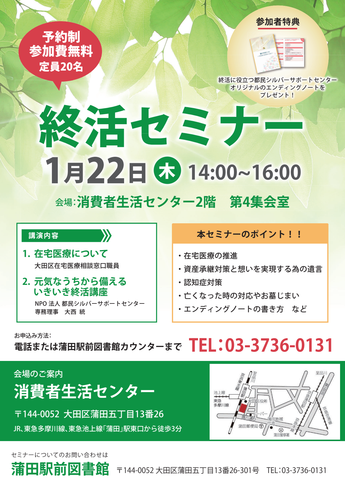 「住み慣れた地域でいつまでも」を目標に、在宅療養生活や老後のさまざまなリスクへの備えを学びます。参加者特典として、オリジナルエンディングノートをプレゼント致します。