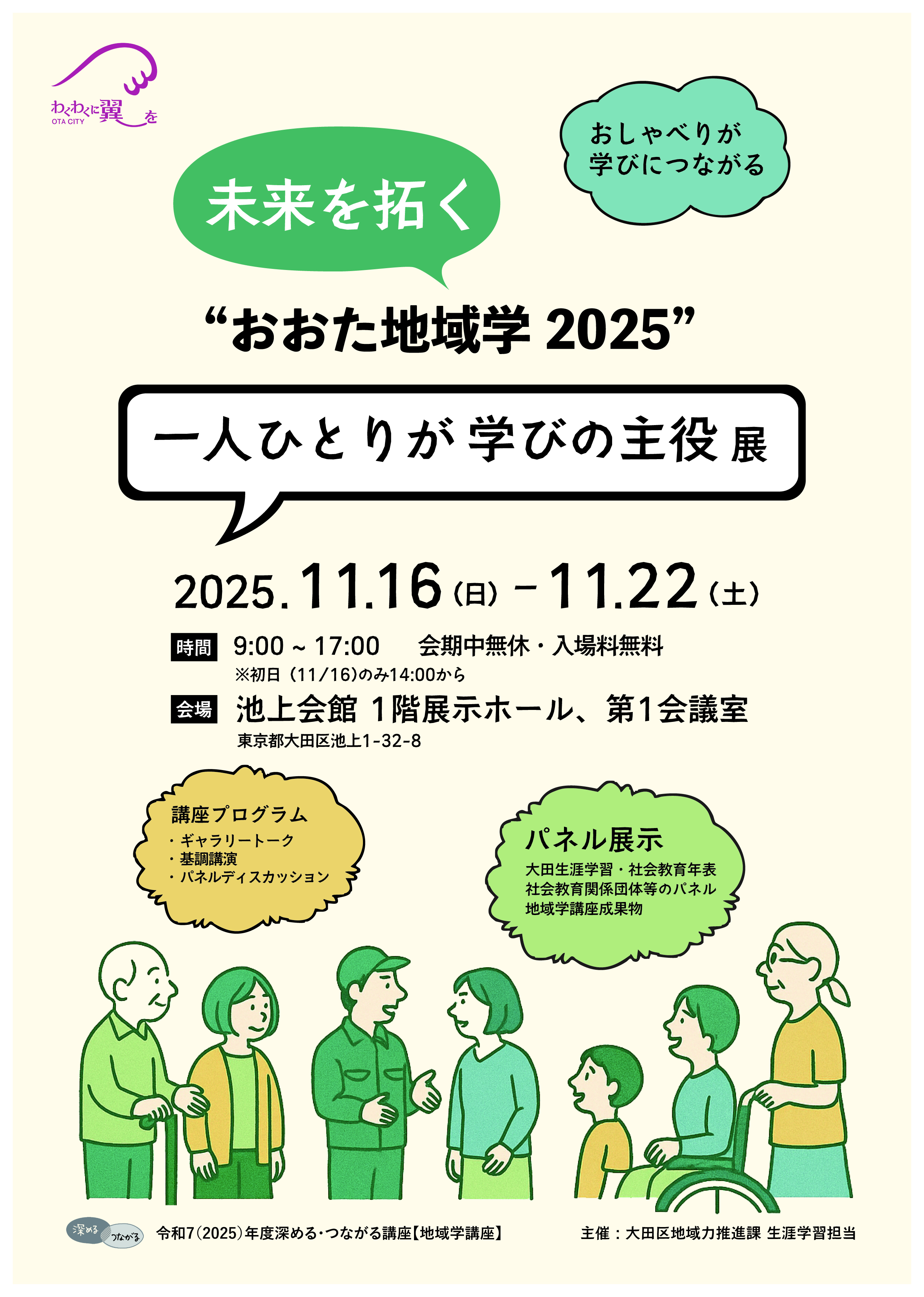 大田区では、一人ひとりの興味・関心を出発点に、人と人が出会い、語り合い、地域への理解と愛着を育む「地域学講座」を実施してきました。