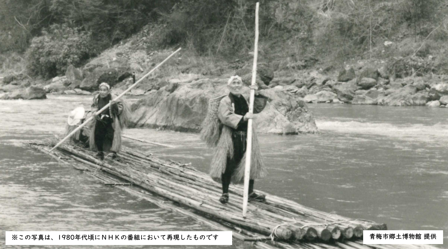 筏流しの画像は、1980年代頃にNHKの番組において、再現したものです。青梅市郷土博物館よりご提供いただきました。