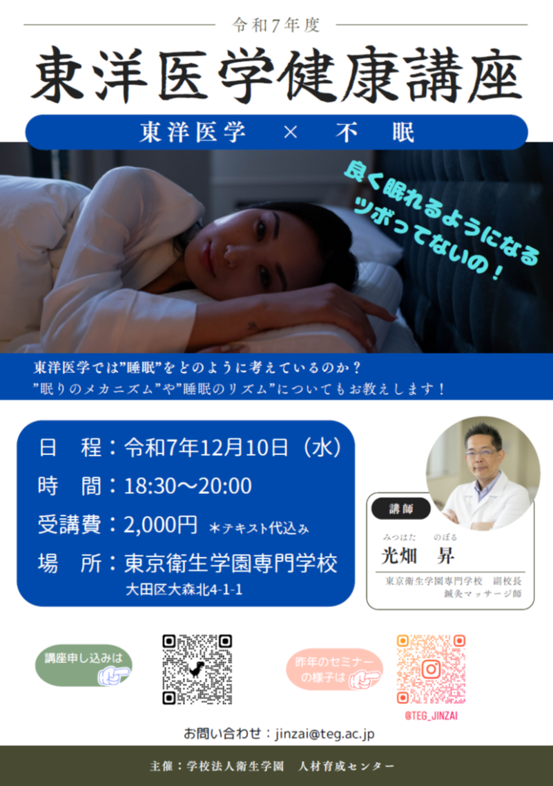 東洋医学では“睡眠”をどのように考えているのか?“眠りのメカニズム”や“睡眠のリズム”についてもお教えします!講師: 東京衛生学園専門学校 副校長 鍼灸マッサージ師 光畑 昇(みつはた のぼる)